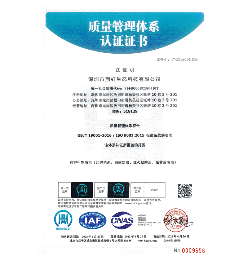 深圳市翔虹生態(tài)科技有限公司成立于1995年,是深圳最早成立的專業(yè)蟲害防治公司之一。公司發(fā)展至今獲得全國有害生物防制服務(wù)A級資質(zhì)、廣東省有害生物防制服務(wù)A級資質(zhì)、深圳市有害生物防制服務(wù)A級資質(zhì)、廣東省有害生物防制服務(wù)A級資質(zhì)、深圳市有害生物防制服務(wù)甲級資質(zhì)的單位,是中國有害生物防治協(xié)會會員、廣東省有害生物防治協(xié)會會員、深圳市有害生物防治協(xié)會理事單位,多次獲得“深圳市十佳消殺單位”榮譽。